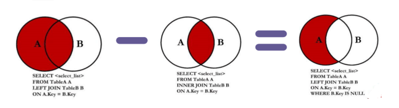 以左中图为例,这是基于左外连接变化而来的情况,想要得到它可以分为如下步骤: